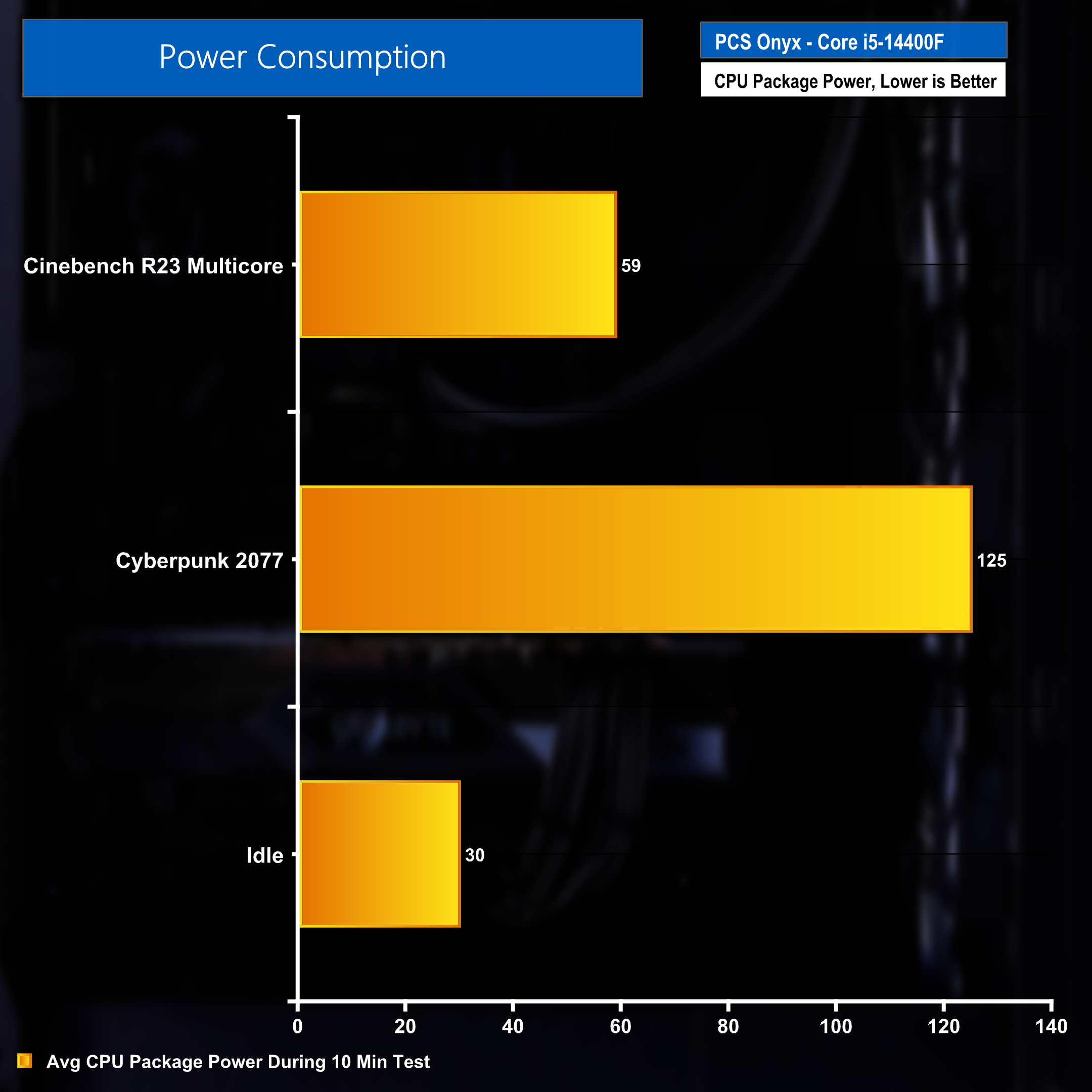 Power consumption was measured at 30W when idle, rising to 59W when running a sustained Cinebench multicore benchmark and peaking at 125W during a 30 minute Cyberpunk 2077 gaming stress test.