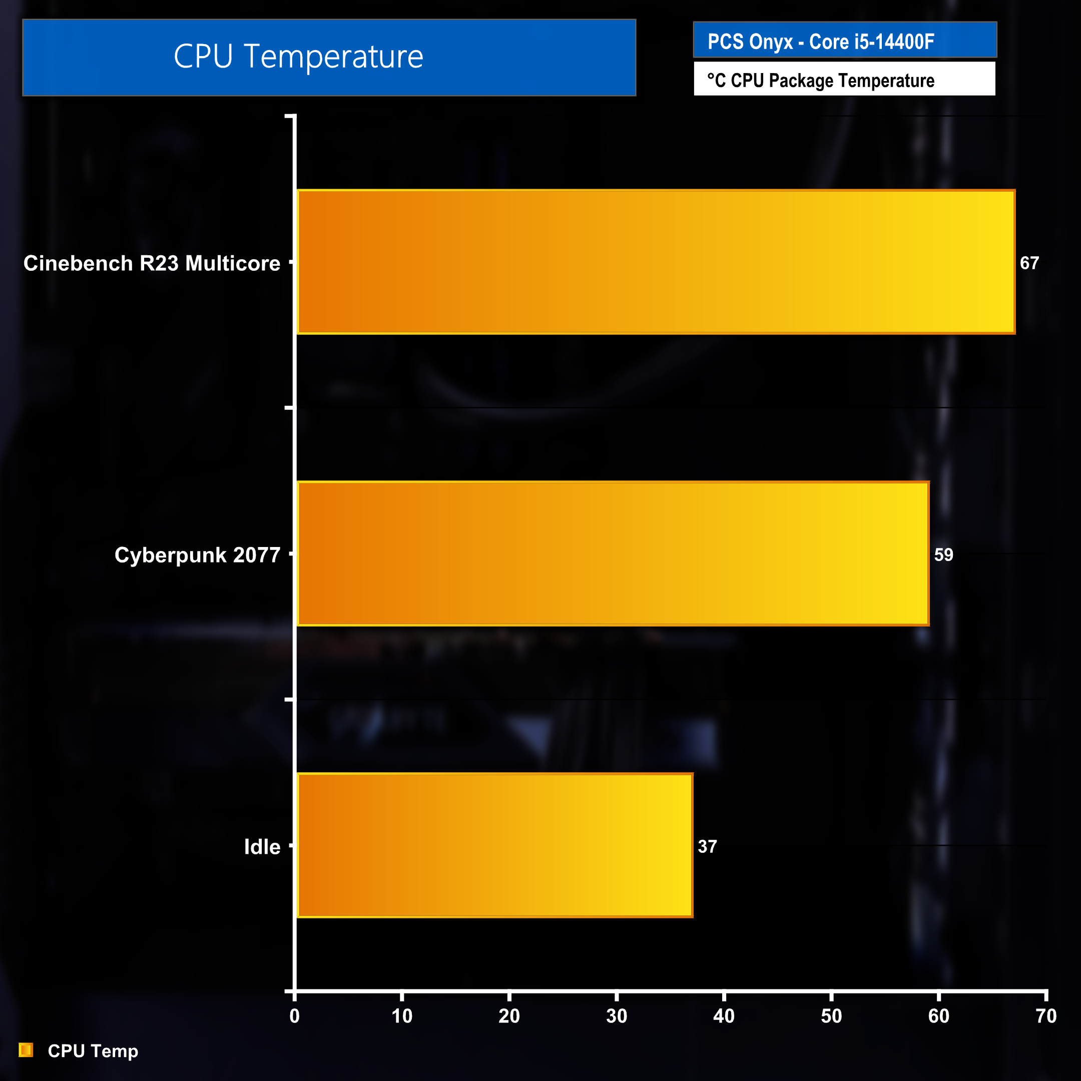 CPU temperature was understandably highest during that same Cinebench benchmark, peaking at 67 degrees. Gaming saw the CPU reach 59 degrees, while idle temperatures were measures at 37 degrees Celsius.