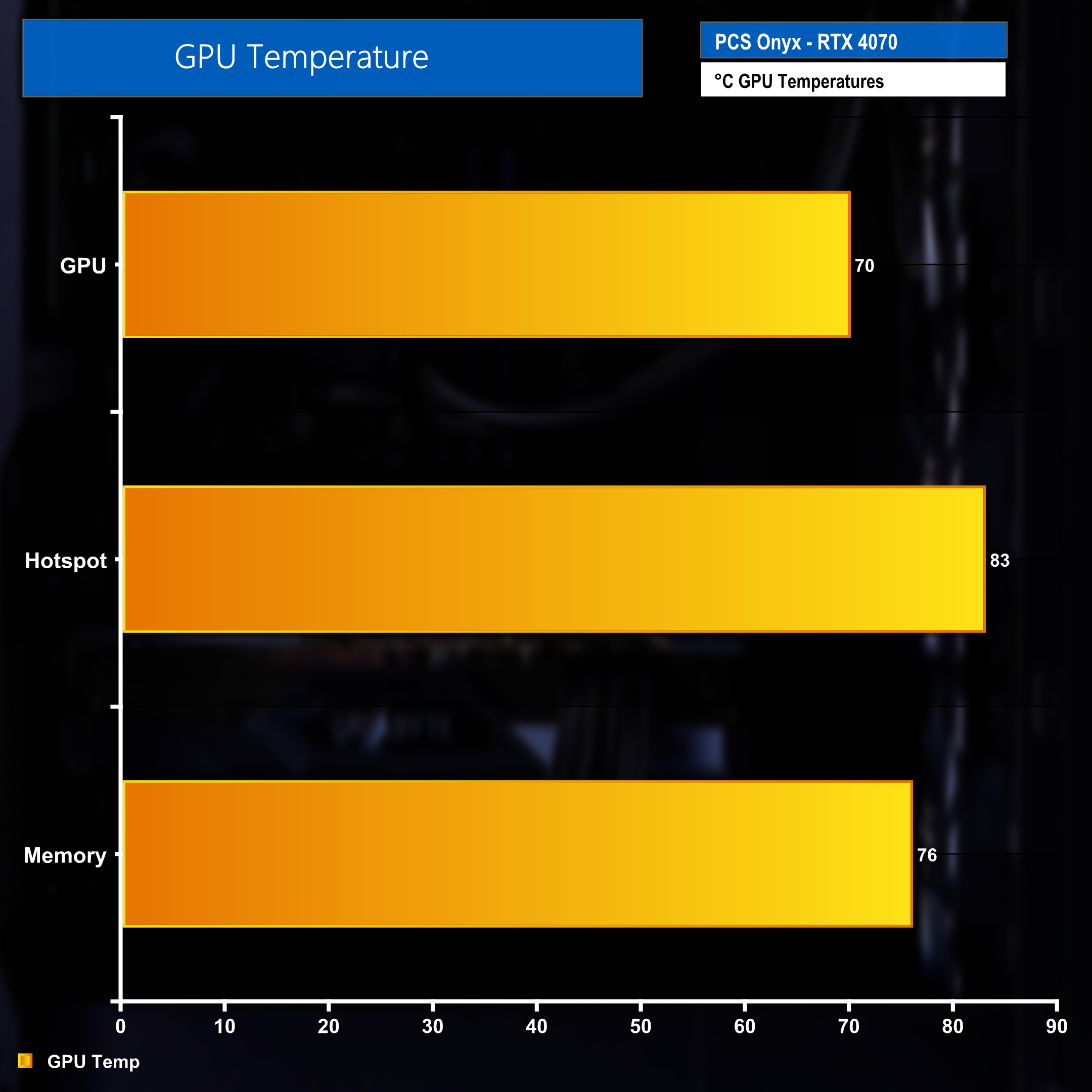 GPU temperatures were recorded during a 30 minute gaming stress test using Cyberpunk 2077, running at maximum settings and 1440p resolution. The GPU reached a peak temperature of 70 degrees, whilst the Hotspot and Memory Junction readings were 83 and 76 degrees Celsius respectively.
