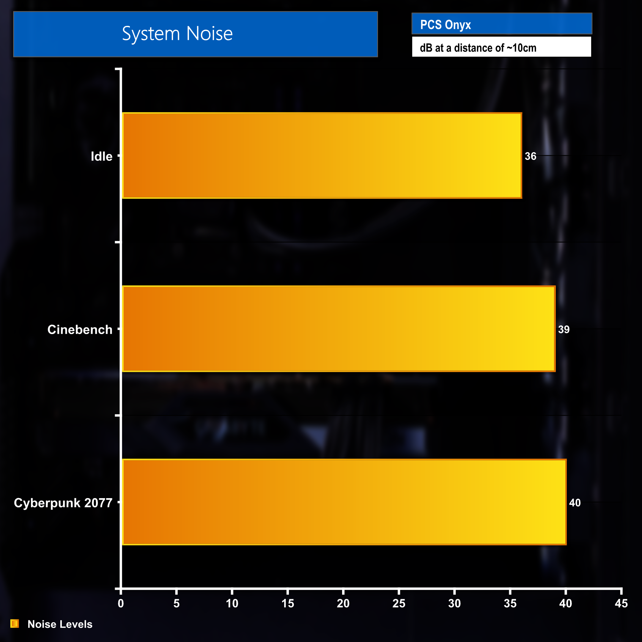 Finally, system noise only changed marginally across our 3 different test scenarios. Reaching a peak of 40dB during a prolonged gaming test in Cyberpunk 2077.