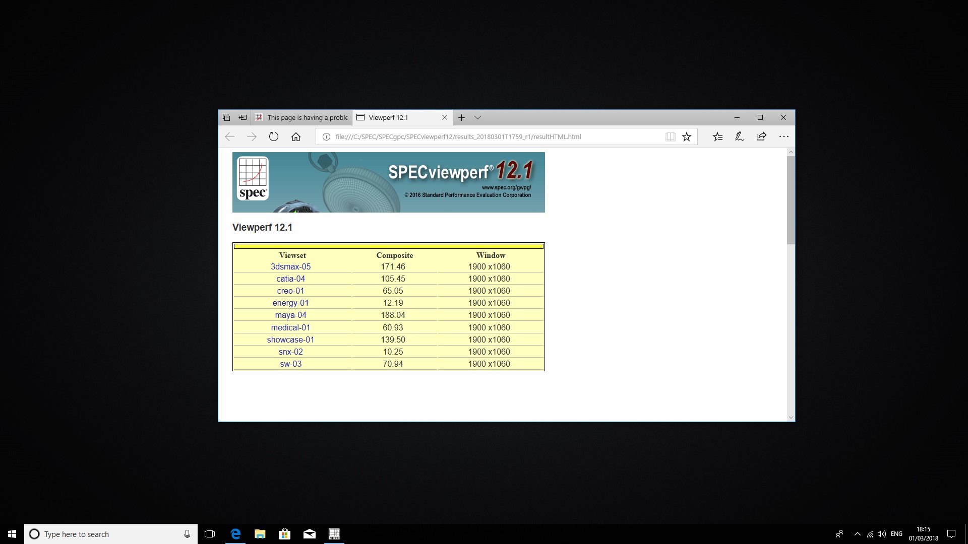The SPECviewperf 12.1 benchmark is the worldwide standard for measuring graphics performance based on professional applications. The benchmark measures the 3D graphics performance of systems running under the OpenGL and Direct X application programming interfaces. The benchmark’s workloads, called viewsets, represent graphics content and behaviour from actual applications.