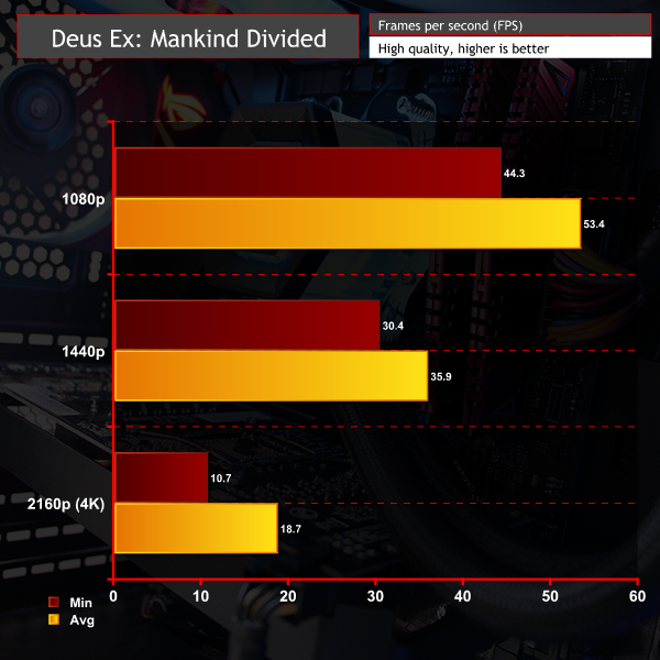 The same situation occurred in Deus Ex: Mankind Divided. While the Falcon’s 1080p result of 53.4fps is good, the Overclockers machine managed 62fps. It was playable at 1440p, but newer, tougher games will quickly prove too much for the 3GB card to handle – whereas the 6GB version of the GTX 1060 will always have more graphical headroom thanks to its increased CUDA core count.