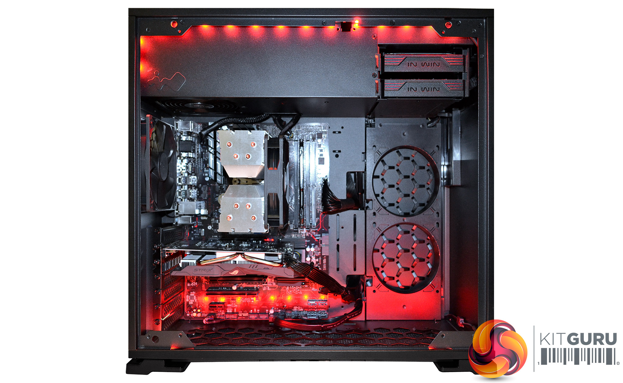 The InWin’s no-nonsense design gives way to an interesting interior. The In-Win case flips convention on its head by installing the power supply at the top of the chassis, with the motherboard positioned below.