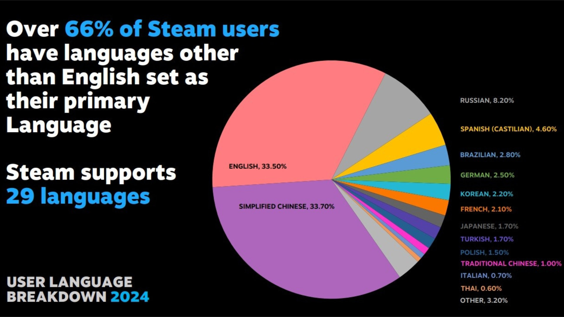 As part of Valve’s recent Game Developers Conference talk (reported by GameDiscover), the company offered a new breakdown of Steam’s user stats. According to the platform holder, Simplified Chinese is now the most-used language on Steam, taking up 33.7% of all active accounts (with English landing at second place with 33.5%).