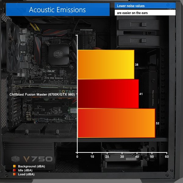 We measured acoustic performance in a slightly different environment to previous reviews, so these results cannot be directly compared, as the background noise was 38dBa. However it does show that at idle the Fusion Master only increased this to 41dBa, which indicates very quiet normal performance. Subjectively, in use, the system appears to be silent.