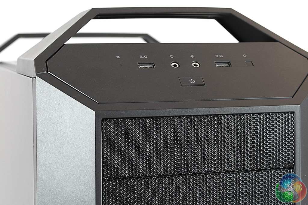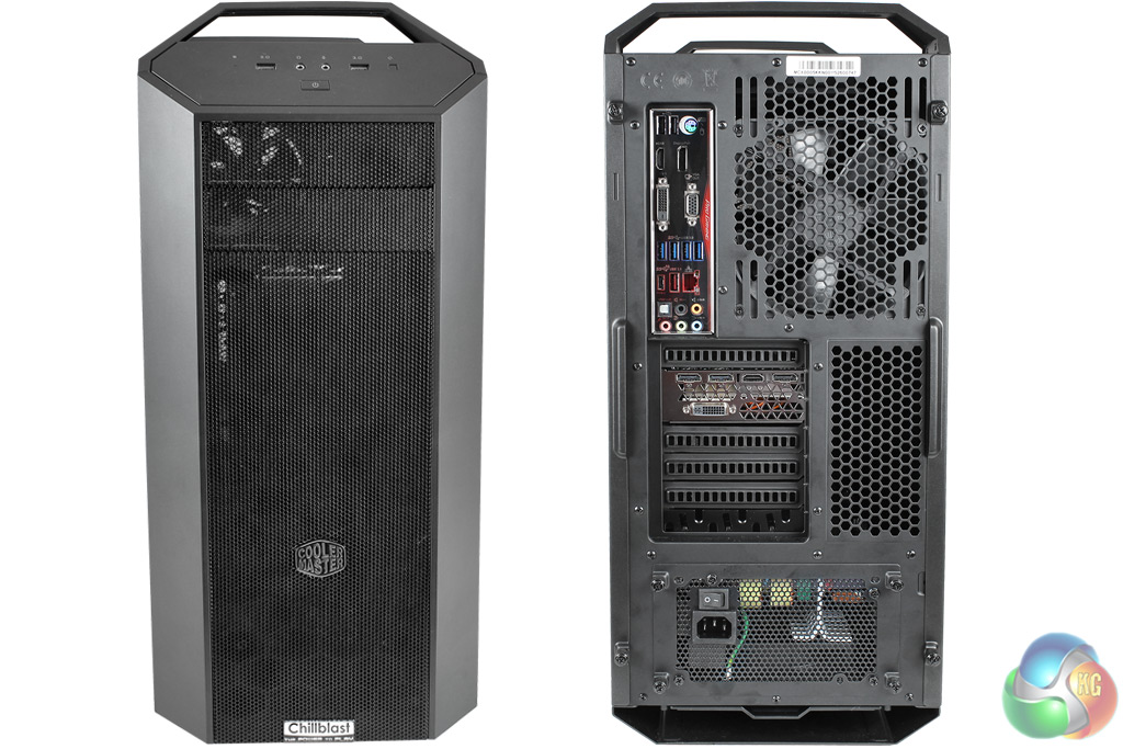 The Chillblast Fusion Master is a showcase of the new MasterCase 5 mid-tower chassis from Cooler Master. Externally, one of its most noticeable features is a pair of handles that help with transportation. On the front panel, the main power button is located at the bottom, with a single LED for disk access, two USB 3 ports and two audio jacks. The reset button is on the right.