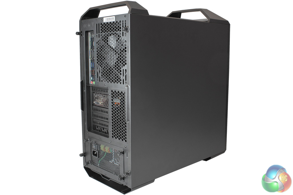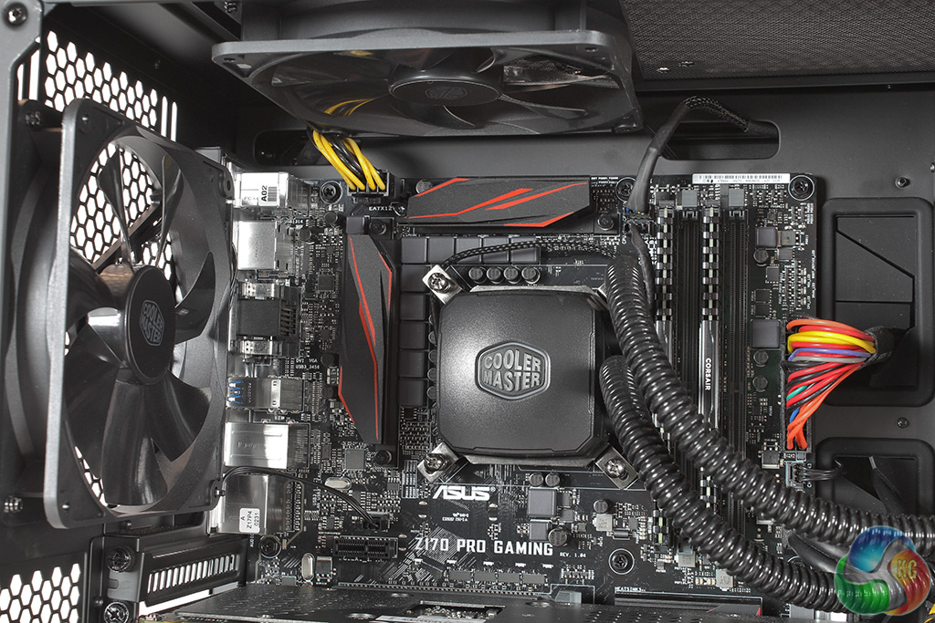 Exhaust fans mounted in the roof and rear of the case expel hot air from inside. The water-cooling block covering the CPU shows the Cooler Master logo clearly, and this illuminates in white when the PC is turned on.
