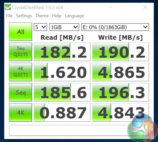 The SSD speed is one of the fastest results we’ve ever seen from Crystal Disk Mark, while the 190 MB/sec achieved by the Seagate SSHD is also quite good.