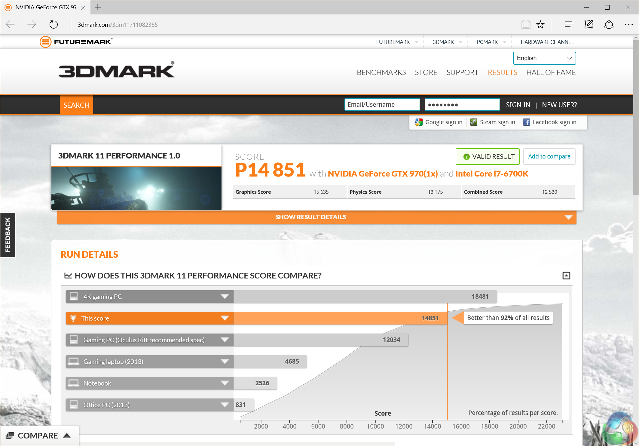 The graphics score in 3DMark11 stresses the GPU more than any other component. With an overclocked Core i7 6700K pushing polygons to the GPU, the GeForce GTX 970 performs slightly better than in a system with a slower CPU.