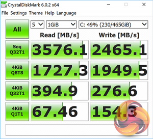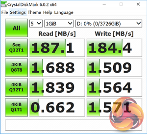 Using the default 1GB file size on CrystalDiskMark we test both the M.2 SSD and Seagate hard drive to get an indication of performance and speeds.