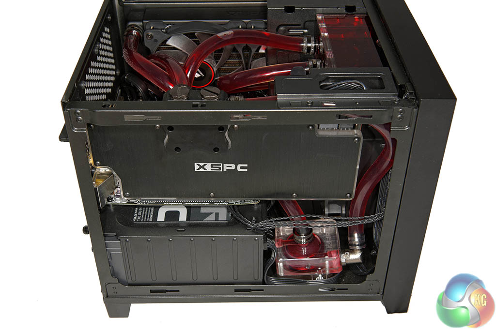 The custom XSPC reservoir is installed at the front of the case in the optical drive bay, shown above. Several USB 3.0 ports are located at the side, along with a microphone and headphone jack.