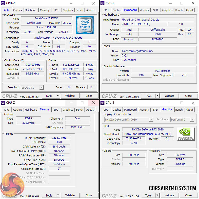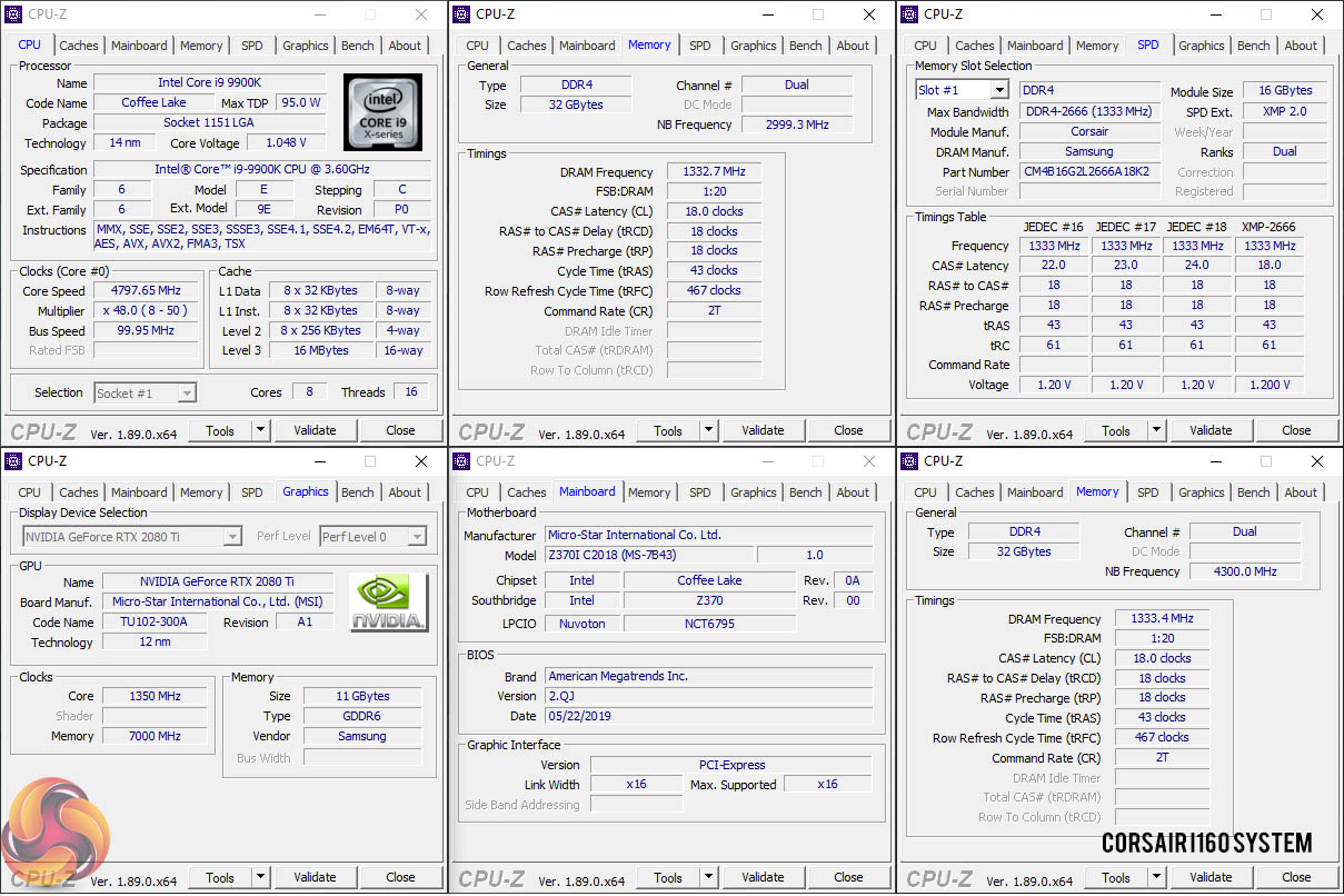 Corsair are using two 16GB DDR4 memory sticks in dual channel for a total of 32GB – these are Vengeance sticks from their own range (not a surprise lets be honest!). The memory is running at 2666mhz with 18-18-18-2T timings. Both RTX 2080 and RTX 2080 ti are also manufactured by MSI and are using Samsung GDDR6 memory in 8GB and 11GB configurations respectively.