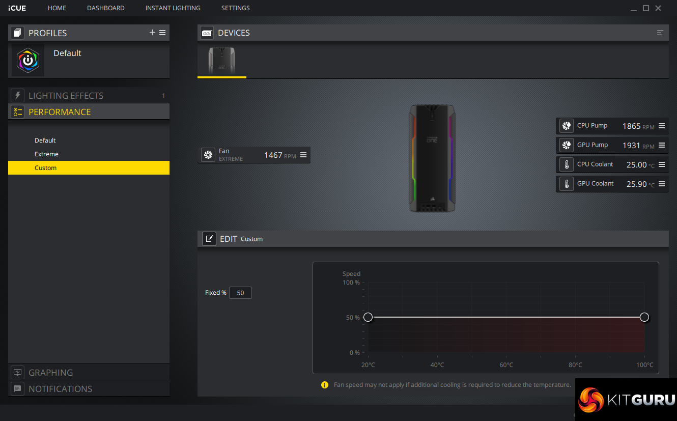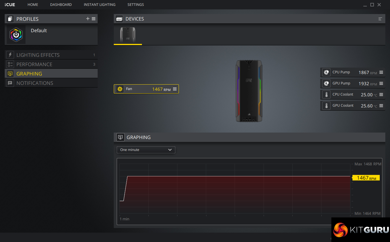 The main panel of interest is the Performance section which lets you customise the top exhaust fan speed. At ‘Default' Corsair have set the fan up to be as passive as possible. Under low and moderate load conditions the fan will not spin up at all, which might be concerning considering the high end hardware inside. The ‘Extreme' setting, pushes the fan to full speed settings – around 1,500 rpm.