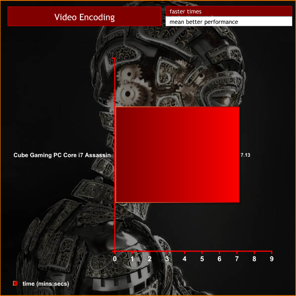 A final encode time of 7 minutes and 13 seconds is one of the fastest we have documented to date. The overclocked i7 4770k combined with the overclocked GTX770 and fast Solid State drive ensure great real world performance characteristics.