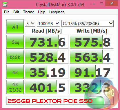 The Plextor PCIE SSD drive delivers better results than the fastest SATA 3 drives, achieving 731MB/s in the sequential read test. 4K QD32 performance is also very strong.