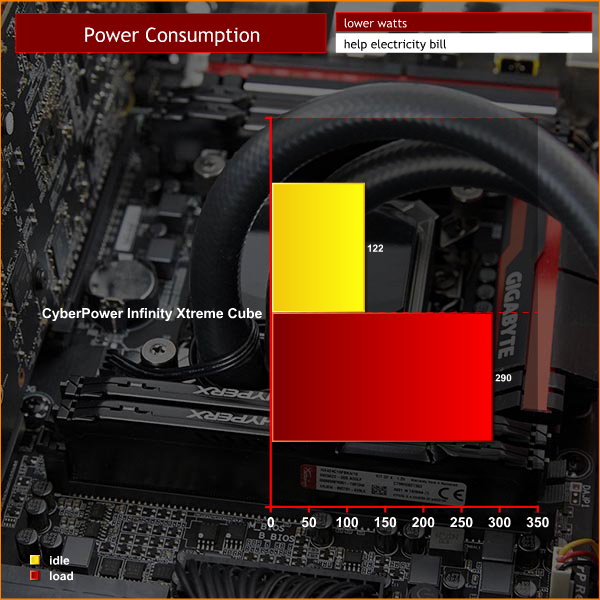 The system consumes 122 watts when idle, this seems higher than normal, but it is related to the core voltage increases and overclocked state of the processor. When gaming, this rises to 290 watts.