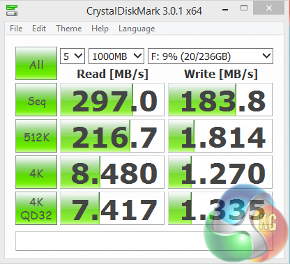 Performance from the USB 3.0 ports is impressive, almost hitting 300 MB/s in the sequential read test.