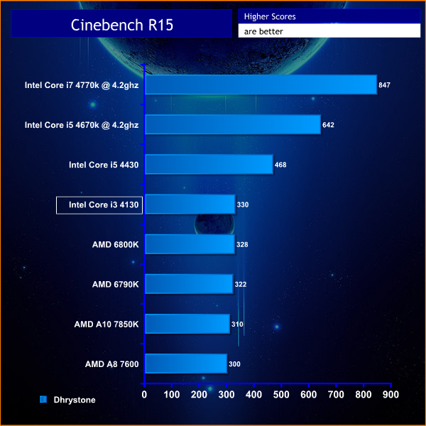 The latest Cinebench rendering benchmark places the Core i3 4130 almost neck and neck with the AMD 6800K.