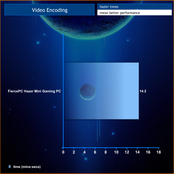 The system completes the test in 14 minutes and 20 seconds, which is reasonably fast. For comparison purposes, the fastest overclocked i7 systems will complete the same task in around 7 minutes. The older Intel ATOM powered systems would take well over an hour to complete the same task.