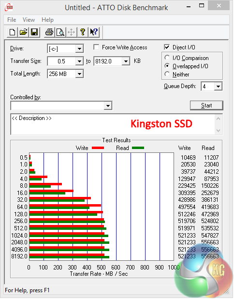 Atto Performance is very strong for the Solid State Drive – peaking at 555MB/s read and 520 MB/s write.
