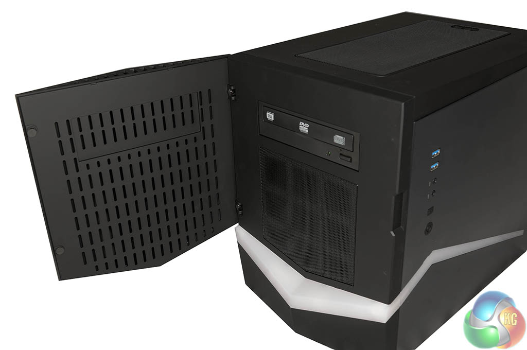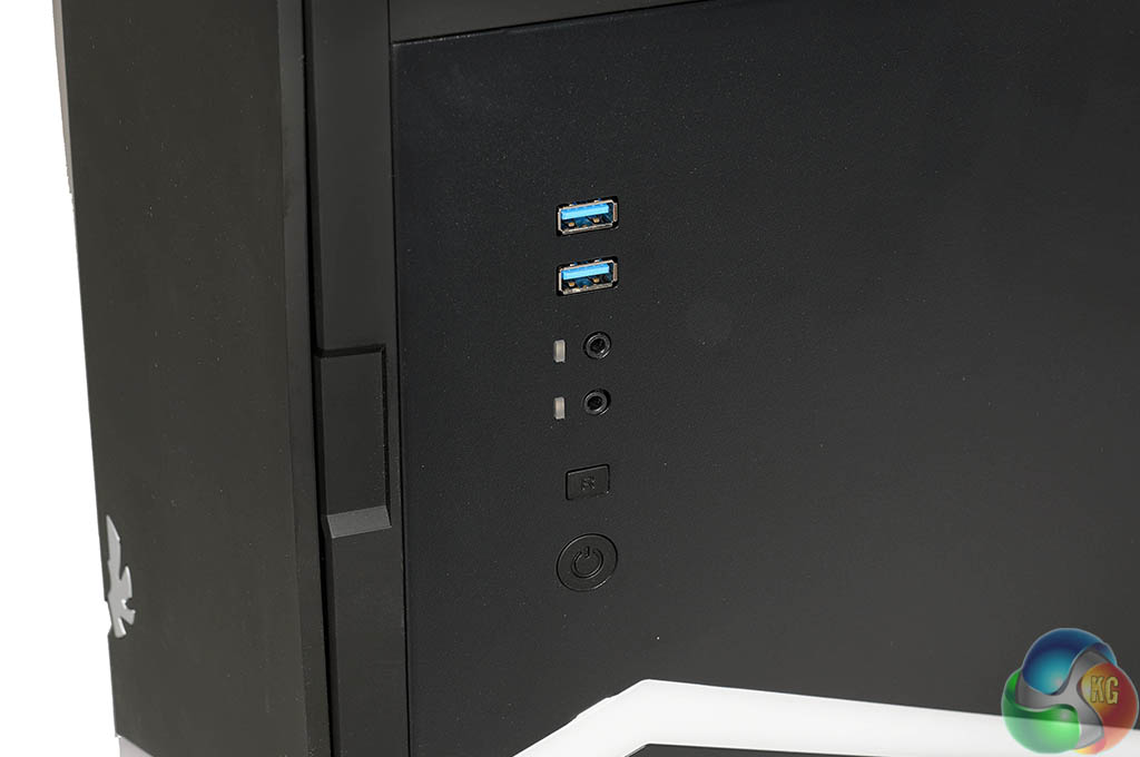 The I/O panel is situated on the right side panel. There are two USB 3.0 ports here, alongside a microphone and headphone jack. Underneath is the power and reset button.