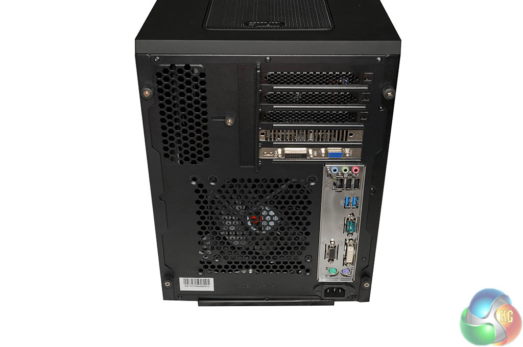 The rear of the case highlight the Gigabyte GA-H81M-S2PV motherboard I/O panel, the graphics card connectors, and a large exhaust fan.
