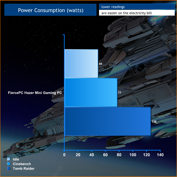 We measure the system power consumption at the wall – not factoring in the monitor. We test when idle – then when loading with Cinebench R15 and when playing Tomb Raider.