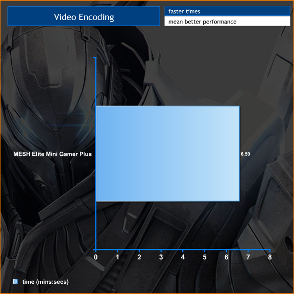 The MESH Elite Mini Gamer Plus completed the encoding task in 6 minutes and 59 seconds, which is extremely fast. As a reference point, the last generation Intel ATOM processors complete the same task in around 1 hour and 15 minutes. If encoding is important, always worth spending a little extra on a fast processor.