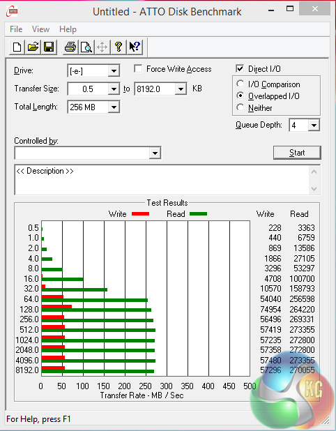 ATTO performance is lower than CrystalDiskMark, peaking at 270 MB/s read and 75 MB/s write.