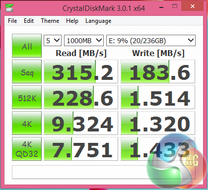 Performance is very impressive, peaking at 315.2 MB/s in the sequential read test.