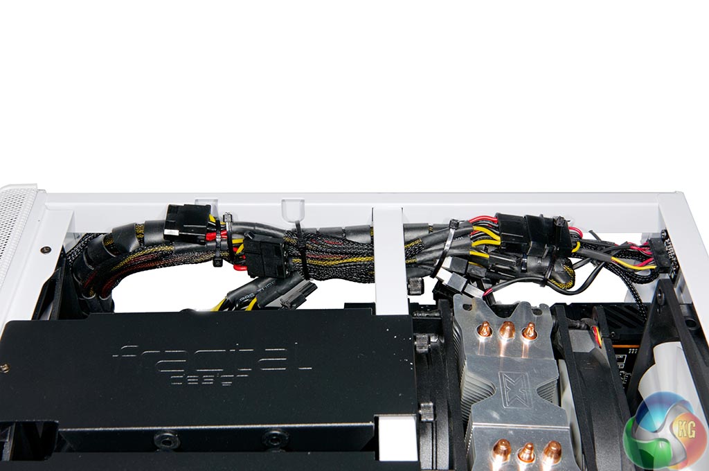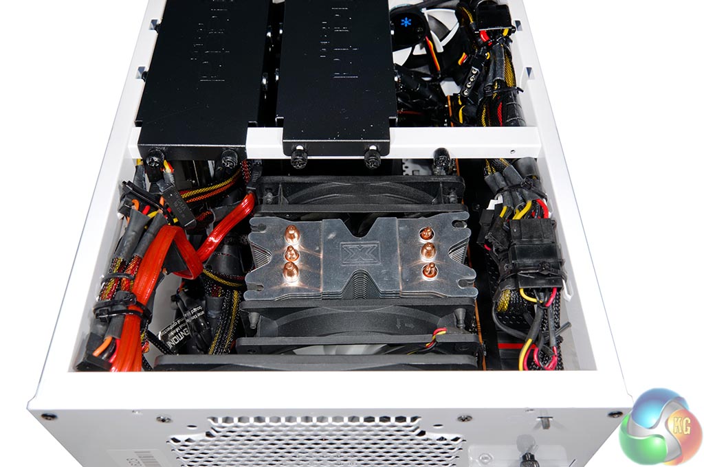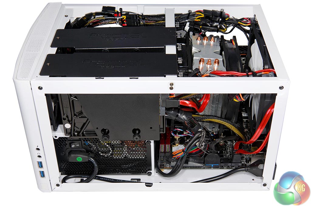 The insides of the MESH Elite Mini Gamer Plus System are neatly put together and we can see that they are using a Xigmatek Gaia SD1283 cooler on the Intel Core i7 4770k processor. MESH told us that they have upgraded the cooler since we received this review sample – they are now using the Thermalright True Spirit 120. They say this will not cost the consumer any extra even though it is £10 more expensive to incorporate into this build.