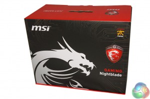 The MSI Nightblade ships in a large, heavy box with the name of the product underneath the company logo. The MSI Dragon takes up most of the real estate here.