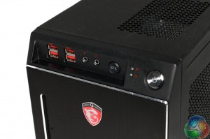 The case measures 345.8 mm x 227.3 mm x 175.7 mm and weighs 7.6kg in a barebones configuration. We wouldn't say the case is the most attractive. The ‘boxy' design does look slightly more old fashioned than the new models from Aerocool and BitFenix, however it is certainly well put together. The case is constructed from steel but MSI have coated it with Zinc to prevent rust and wear. The front of the case is ‘brushed metal' with diamond cut edges.