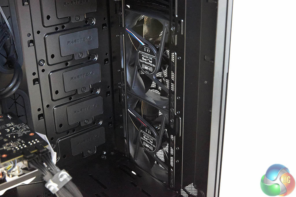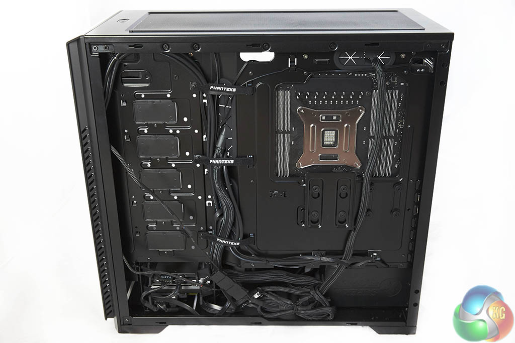 All the cables are routed out of sight, at the rear of the motherboard tray. OCUK have tied them down in multiple places to ensure the rear panel won't bulge when closed.