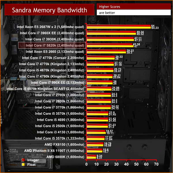 The overclocked Core i7 5820k scores as we would expect – aided by the overclock to 4.2ghz. The quad channel memory scores well, around 45GB/s.