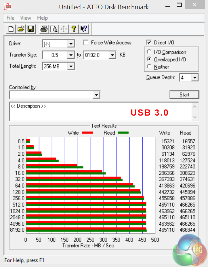 ATTO produces similar results, hitting peaks of around 460MB/s.