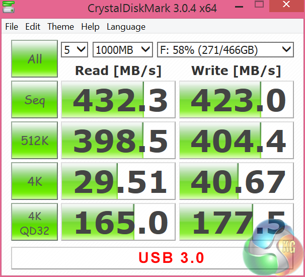 To test USB 3.0 performance we need a drive that is capable of completely saturating the bus. Until recently we used the Corsair Voyager GTX drive, one of the fastest pen drives on the market. We have recently switched to using a 500GB Brinell Drive, available on Amazon for around £250 inc vat. Inside is a 500GB SAMSUNG EVO 840 SSD, a product all our readers are familiar with.