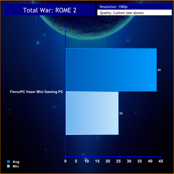 Total War: ROME 2 is an incredibly demanding engine and even a single R9 295X2 can drop to 27 frames per second at Ultra HD 4K resolutions – at the ULTRA setting. The OverclockersUK “Infinity Vesuvius” R9 295X2 QuadXFire System produces an average of 109 frames per second, staggering performance. With the image quality settings toggled to EXTREME, the system maintains smooth frame rates, dropping only once below 30 frames per second.