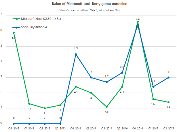 Typically, sales of video game consoles drop in Q1 and Q2 and then recover in Q3 and Q4. Shipments of Sony’s PS4 managed to increase both sequentially and year-over-year in the second quarter of 2015. It is clear why PS4 performs better than the industry, but it is rather surprising that it performs better than it should in this part part of the year. Perhaps, Sony can finally fulfill demand for its latest console and gamers who could not obtain the hardware before got the device in the second quarter of the year.