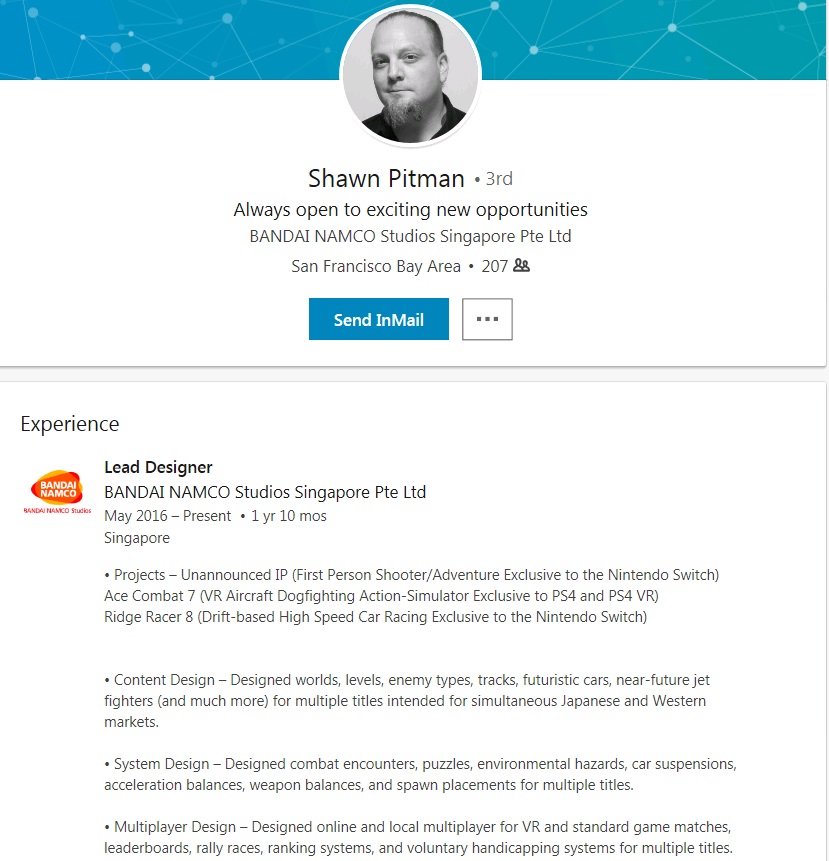 The reference to Bandai Namco’s new FPS was found by YouTuber Doctre81, who dug out the Lead Designer, Sawn Pitman’s LinkedIn profile. Their job description lists some of the proposed projects that the developer is working on, including that of an “Unannounced IP” of the FPS/Adventure variety, alongside Ace Combat 7 exclusively for PlayStation and PSVR as well as Ridge Racer 8 exclusively for the Nintendo Switch.