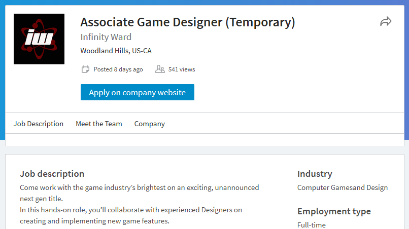 Following the launch of Treyarch’s Call of Duty: Black Ops IIII later this year, developer Infinity Ward is expected to continue the three year cycle with its own entry in 2019. A recent job listing, however, suggests that the developer is in the midst of hiring “the game industry’s brightest on an exciting, unannounced next gen title.”