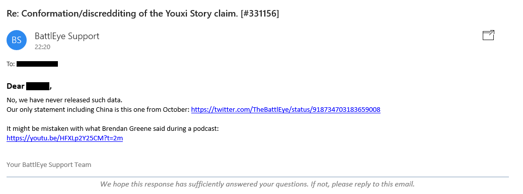 As I originally expected, the information reported by Youxi Story might have been a little blown out of proportion, as the only details released by BattlEye pertaining to the scale of cheaters coming from China specifically has been this Tweet. Instead, the anti-cheat maker suggests that the percentage might have been confused with something said by PlayerUnknown himself in this podcast.