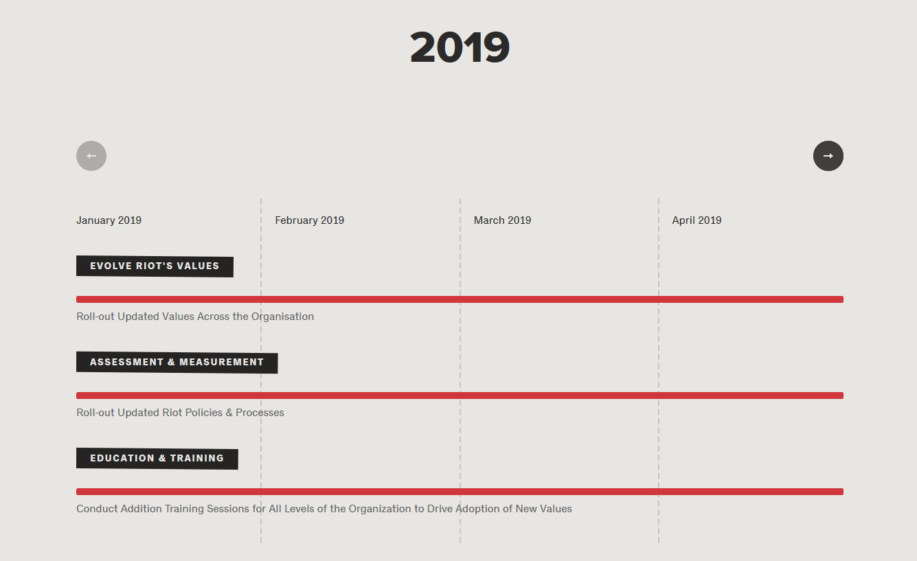 “In 2012 we wrote our manifesto: a statement of who we believed we were as a young company still at the beginning of its journey,” Riot explains on its newly updated “values” page. “It served us well for many years, but didn’t evolve along with us. Today, we need values that represent who we want to be for our next chapter.”