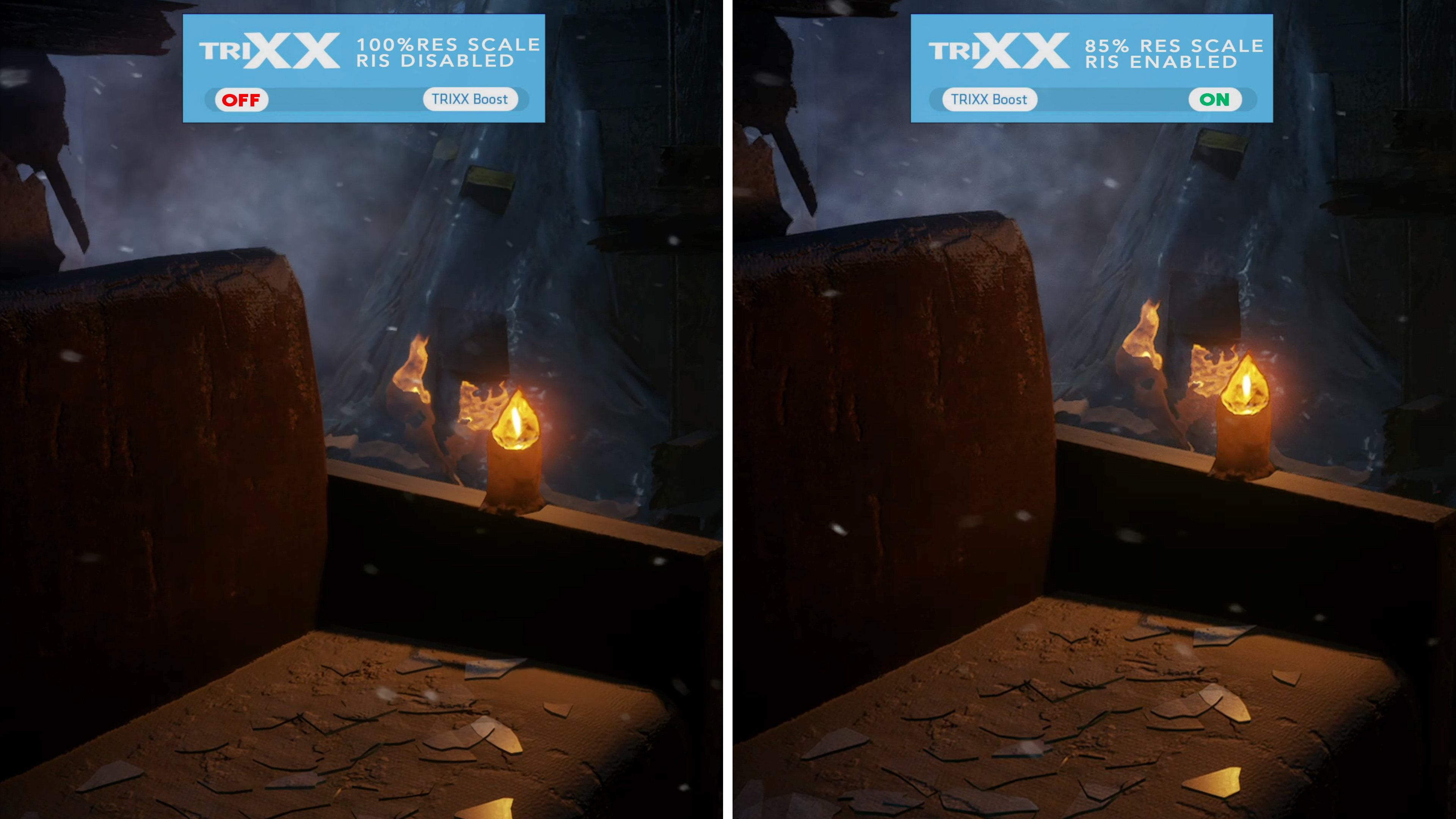 Our last example comes from Metro Exodus, and there is very little difference between these two images. If anything, the flame on the right hand side looks a bit clearer and more well-defined, while the wood the candle is sitting on also shows a sharper edge to it than the native 4K image. That being said, it would be very hard to tell the difference between these two images in a blind comparison test, and that is surely good news for TriXX Boost.