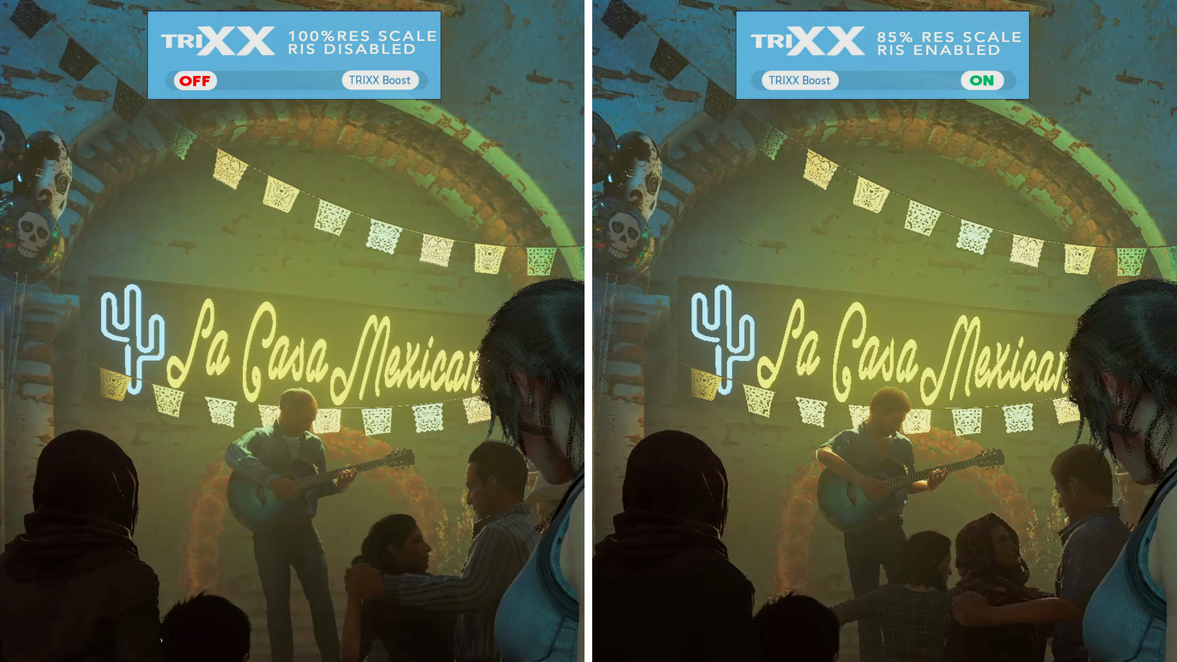 Things goes the opposite way with this next example, where the native 4K image just looks very soft – focus on the lady's face, and her features are barely distinguishable. The image with Trixx Boost and RIS, though, looks a lot clearer and sharper. I would say that the hair again looks more natural at native 4K, as sharpening this results in a grainy appearance. It's still a great result for TriXX Boost though.