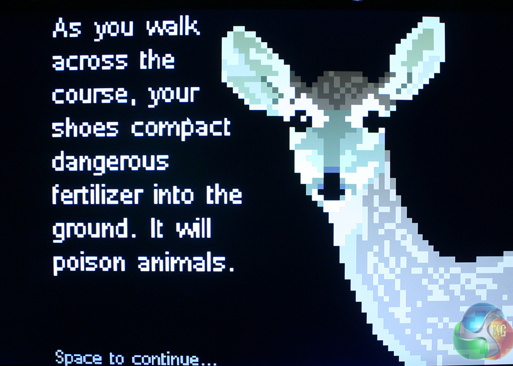 One of my favourites right off of the bat was EnviroGolf, a text based golfing game. All you do is select your club and the strength of your shot. Regardless of what you do though, you're berated by forest animals that are suffering because of the creation and maintenance of the couse you're playing on.