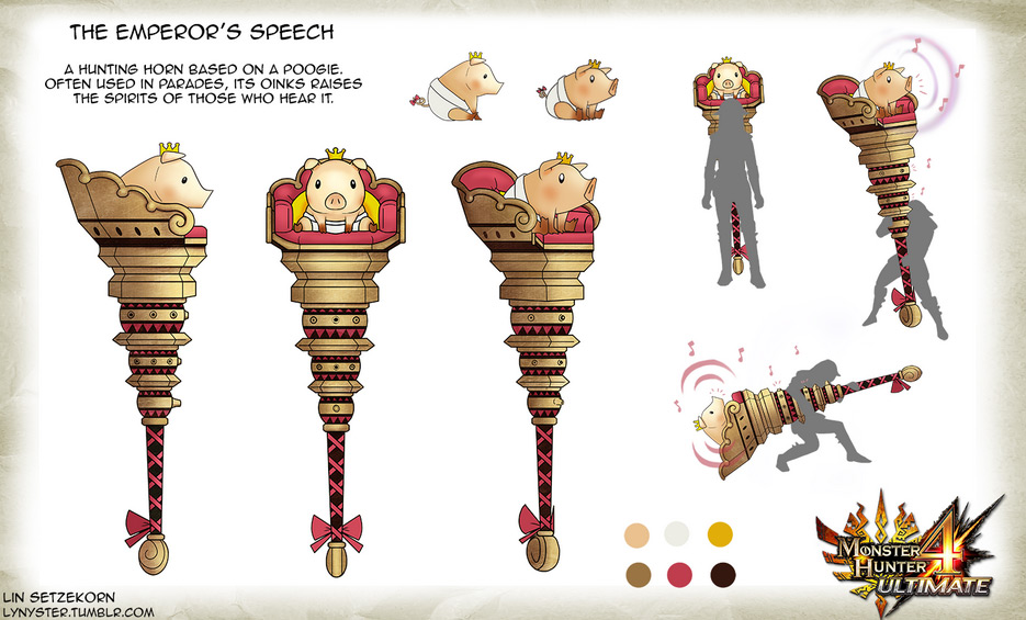 Designed specifically for Monster Hunter 4 Ultimate on the 3DS, this new weapon is called “The Emperor's Speech,” and it's not so much a hunting horn as it is a throne for a poogie. Or a pig, if you're anywhere else but in this game. As you play the horn, the poogie on top will oink away happily, reminding teammates of their pal back at camp and buffing them to fight all the harder.