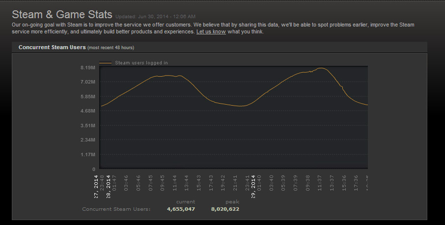 This is its biggest break out since December last year, when it broke through seven million. Just under a year before that, six million was the big news. Clearly Steam is becoming more and more popular and the recent Steam Summer Sale helped push it over the top.
