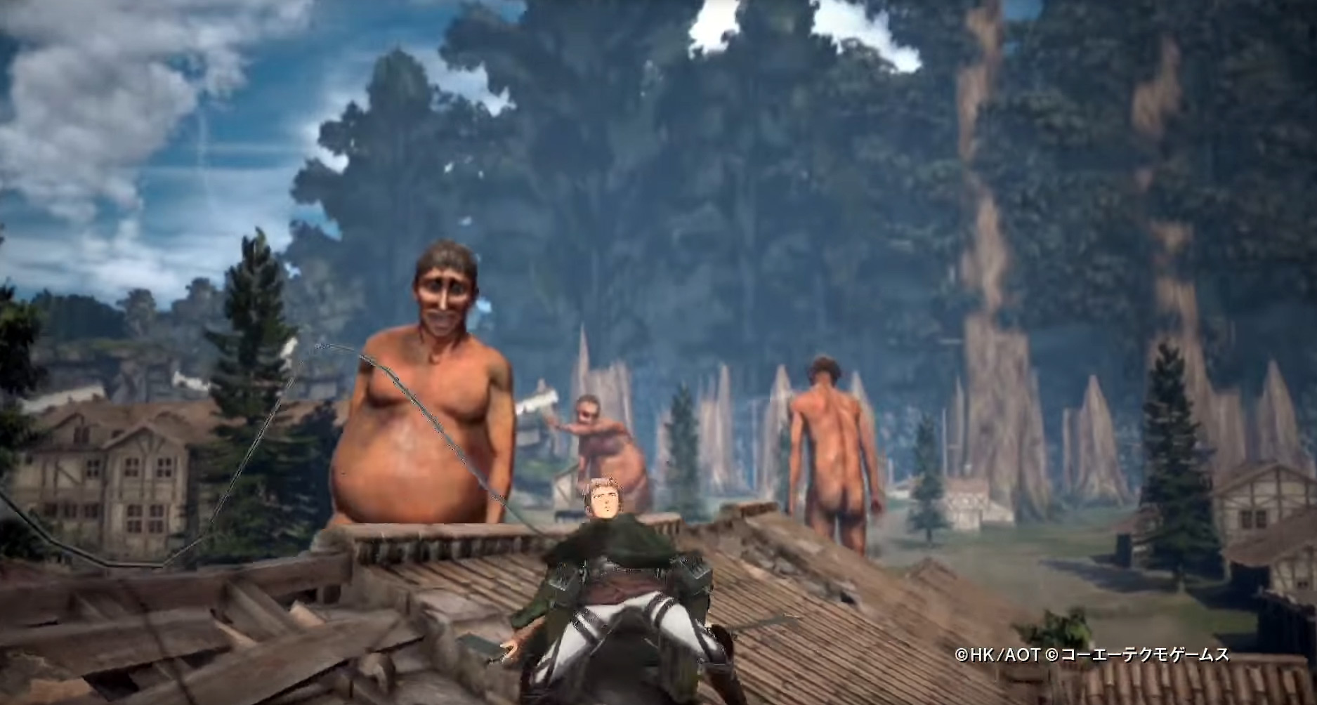 Fighting off the monstrously large Titans in the world of Attack on Titan is a rather creepy experience. Whether you've read through the manga or watched the anime, those 10 story tall, nude-with-no-genitals monsters are always unnerving. The upcoming game for the , Vita, PS3 and PS4 has certainly captured that, with more than a handful of the smiling giants bearing down on the series' heroes in the latest trailer.