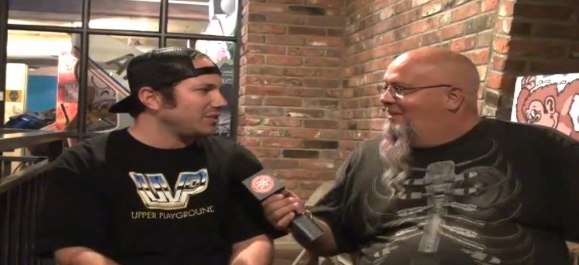 Adler (left) seen here discussing Kong Off 3 and his 1up Arcade/Bar on GrooveyTV